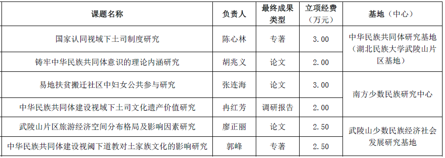 根据《关于申报中华民族共同体研究基地(365电子娱乐官方网站武陵山片区基地)、南方少数民族研究中心、武陵山少数民族经济社会发展研究基地2021年度开放基金项目的通知》和365电子娱乐官方网站校内科研项目相关管理规定,经个人申报、基地(中心)组织专家评审,拟对“国家认同视域下土司制度研究”等6个项目予以立项资助,特此公示,公示时间为2021年5月12日至5月14日。公示期内,如有异议,请向民族学与社会学学院学科建设科反映。联系电话:8297052。