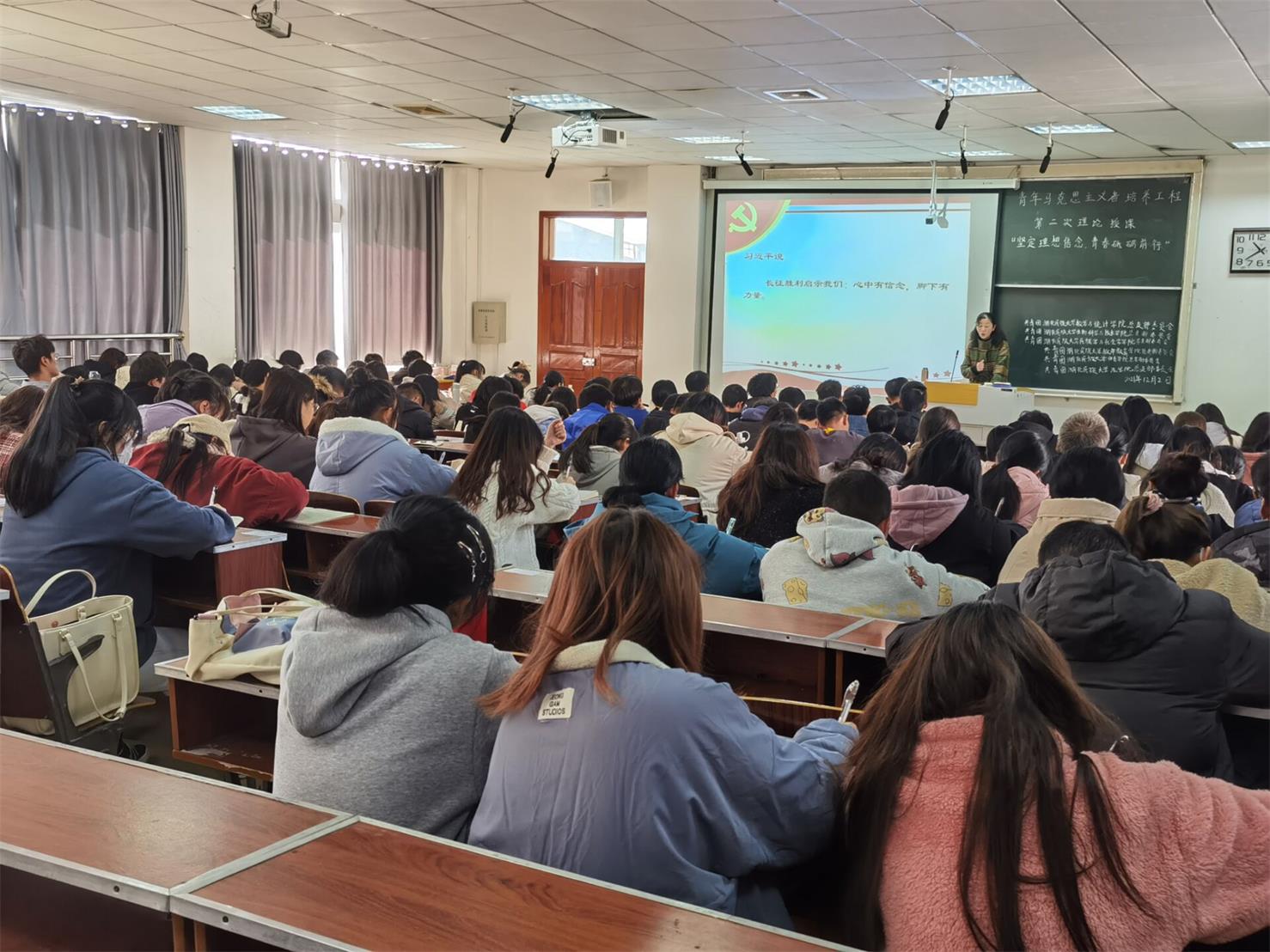 活动伊始,刘际华老师以“坚定理想信念,青春砥砺前行”为主题进行第二次授课。她首先以习近平的话语引出青年肩负历史使命,须坚定理想信念、不负韶华、勤奋学习,争做新时代青年表率。接着,她从“理想信念的内涵”“青春须用来奋斗”两方面具体展开,提出中国共产党有共产主义这个坚定理想信念的引导,才取得成功的观点,并表示作为新时代青年,须立志,立鸿鹄志,做奋斗者、实干家,练就过硬本领,做有理想、有道德、有纪律、有文化的青年。除此之外,她通过介绍毛泽东、周恩来等一系列为我国发展有着杰出贡献的榜样来告诫全体学员要学习榜样,不忘初心。最后,她希望全体学员能够像林鸣、袁辉那样奉献伟大的共产主义事业,祝愿全体学员能够做最好的自己,为社会主义事业而奋斗。