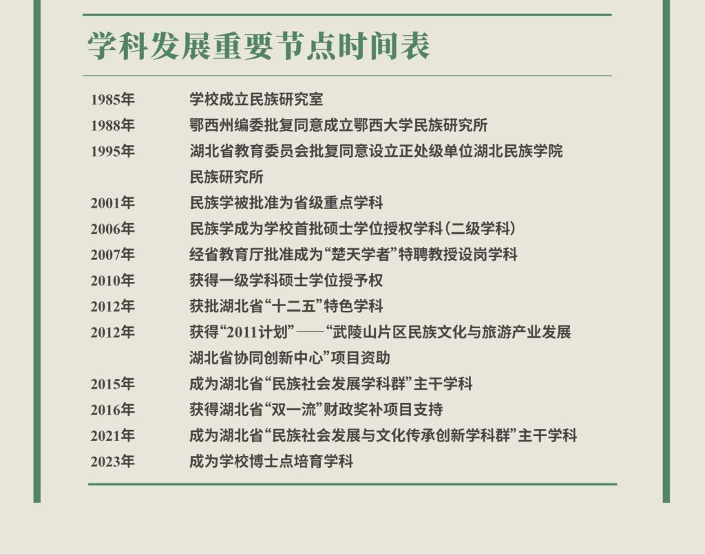 民族学学科是我校首批硕士点授权学科。经过40余年建设,本学科已成为硕士学位授权一级学科、湖北省重点特色学科。原有8个二级学科,分别是民族学、马克思主义民族理论与政策、中国少数民族史、中国少数民族经济、中国少数民族艺术、民族社会学、民族法学、民族体育学。2022年起调整为5个二级学科,即民族学、马克思主义民族理论与政策、中国少数民族史、中国少数民族经济、民族社会学,2025年起按照马克思主义民族理论与政策、中华民族学、人类学与世界民族3个方向招生。学科建有国家民委中华民族共同体研究基地(365电子娱乐官方网站武陵山片区基地)、国家民委民族理论政策研究基地(武陵山片区基地)、武陵山片区基层社会发展研究基地、国家民委国家连片特区(武陵片区)农村贫困问题重点研究基地、南方少数民族研究中心、鄂西生态文化旅游研究中心、武陵山民族文化与旅游产业发展湖北省协同创新中心7个省部级科研平台。2012年,本学科获得湖北省“2011计划”建设项目“武陵山民族文化与旅游产业发展湖北省协同创新中心”。2014年获得湖北省“武陵山民族文化传承与创新”博士点建设对口支持合作项目,与华中师范大学联合培养博士生。2021年获得“民族社会发展与文化传承创新”湖北省学科群建设项目。2023年成为学校博士点培育学科。