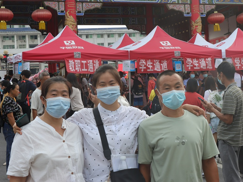 信息工程学院电子信息专业新生田杰与家人在学校大门合影(记者 张倩雯/摄)