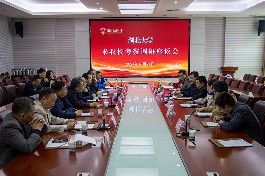 随后,两校在行政楼3号会议室召开座谈会。顿祖义回顾了我校与湖北大学的合作历程,感谢湖北大学长期以来对我校建设和发展给予的大力支持。他表示,学校力争在“十四五”期间达到申报博士学位授予单位的基本条件,并请求与湖北大学联合开展博士生培养工作,进一步加强学科建设、平台建设等方面的合作。