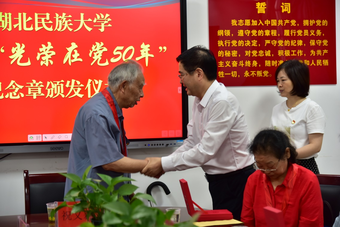 7月1日,学校在离退休工作处会议室举行2024年“光荣在党50年”纪念章颁发仪式。学校党委副书记邓磊出席仪式,为与会老党员颁发了“光荣在党50年”纪念章,并对获得“光荣在党50年”纪念章的老党员表示了祝贺,向为党的事业、为学校的事业所做出的巨大贡献的老党员表达了感谢,并祝福全体老党员健康长寿。