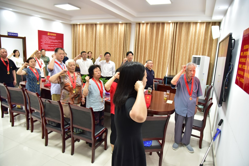 活动现场,全体党员重温入党誓词,老党员们分享了自己的感受和体会。王光炎说,50年前面对党旗庄严宣誓加入了中国共产党,50年后能够参加“光荣在党50年”纪念章颁发仪式,他感到十分荣幸。陈龙全表示,50年前自己由懵懂少年加入中国共产党,今天仿佛回到了当年入党时的状态,退休后自己依旧参与各种社会活动,力所能及的为社会做贡献,感到生活十分幸福和充足。陈正菊说,今天心情十分激动,这些年一直坚持用党员的标准要求自己,也将用党员的标准要求自己直至最后一刻。