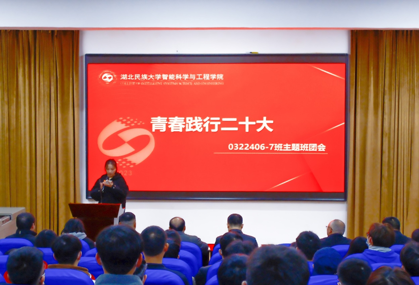 本网讯(记者/梅晨航 吴铭/文 吴菲菲 余思甜/图)为深入学习宣传贯彻党的二十大精神,引领我校广大青年学生坚定理想信念,2月26日晚,我院于集成楼213学术报告厅举办“青春践行二十大”主题班团会。校党委常委、副校长李军,校团委书记吴珊,学院党委书记孙先波、执行院长陈世强、副书记汪涛、副院长钱楷,马克思主义学院万俊老师,0322406、0322407班主任廖红华教授及0322406、0322407班全体学生到场参加。