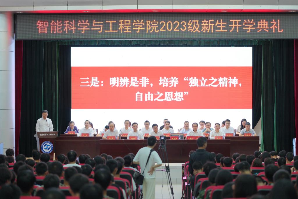 执行院长陈世强首先代表全院师生向来自全国各地的2023级新生表示热烈的欢迎,同时向同学们的家长、老师和亲友们表示衷心的感谢。陈世强首先生从办学背景、办学思路、师资队伍、办学条件等方面向新生介绍了我院的基本情况,我院自办学以来,始终以“融”为核心,以“智能+”为发展理念,以卓越工程师教育为目标,致力于推进“新工科”建设,培养创新性应用型复合人才。然后告诫新生要不负大学美好时光和青春年华,作为实现中华民族伟大复兴新征程上的有生力量,应当在大学生涯中做到以下几点:其一,立德修身,传承和弘扬中华民族优秀传统文化;其二,志存高远,树立“潜心研学,胸怀‘国之大者’”的远大抱负;其三,明辨是非,培养“独立之精神,自由之思想”。最后陈院长寄语新生要努力书写无愧于青春、无愧于时代、无愧于未来的人生华章!