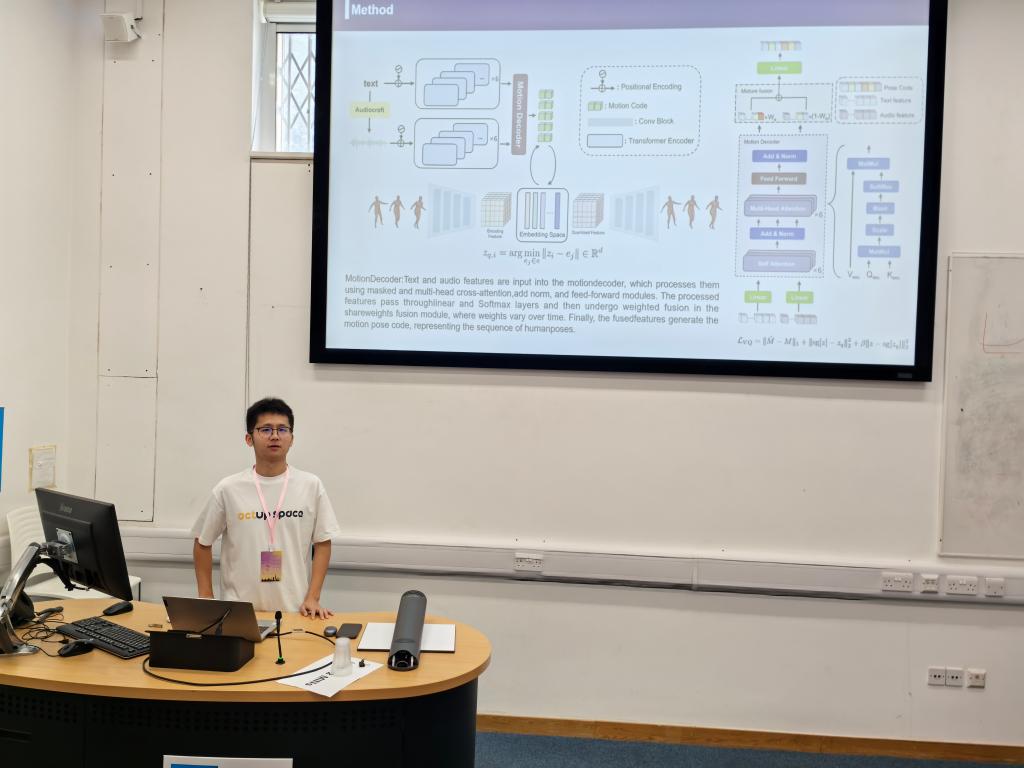 会议期间,团队研究生张业东做了题为“Human Dance Generation via Text-Music Integration”的报告。团队提出了一种名为VTM的新框架,以解决3D舞蹈和音乐节奏一致性方面的挑战。该框架的核心组件是一个跨模态Transformer,通过编码和量化文本和音乐来预测未来的人类运动姿态代码,从而实现与音乐的时序一致性,并协调各种运动节奏和音乐节拍。在真实数据集上的实验和用户研究表明,VTM在质和量上都取得了显著的先进表现。张业东同时作为Session Chair主持了“AI, Intelligent Control, Neuro-Control, Fuzzy Control and Their Applications & Teleoperation, Telerobotics, Haptics, and Semi-Autonomous Systems”Regular Seesion的分组报告。