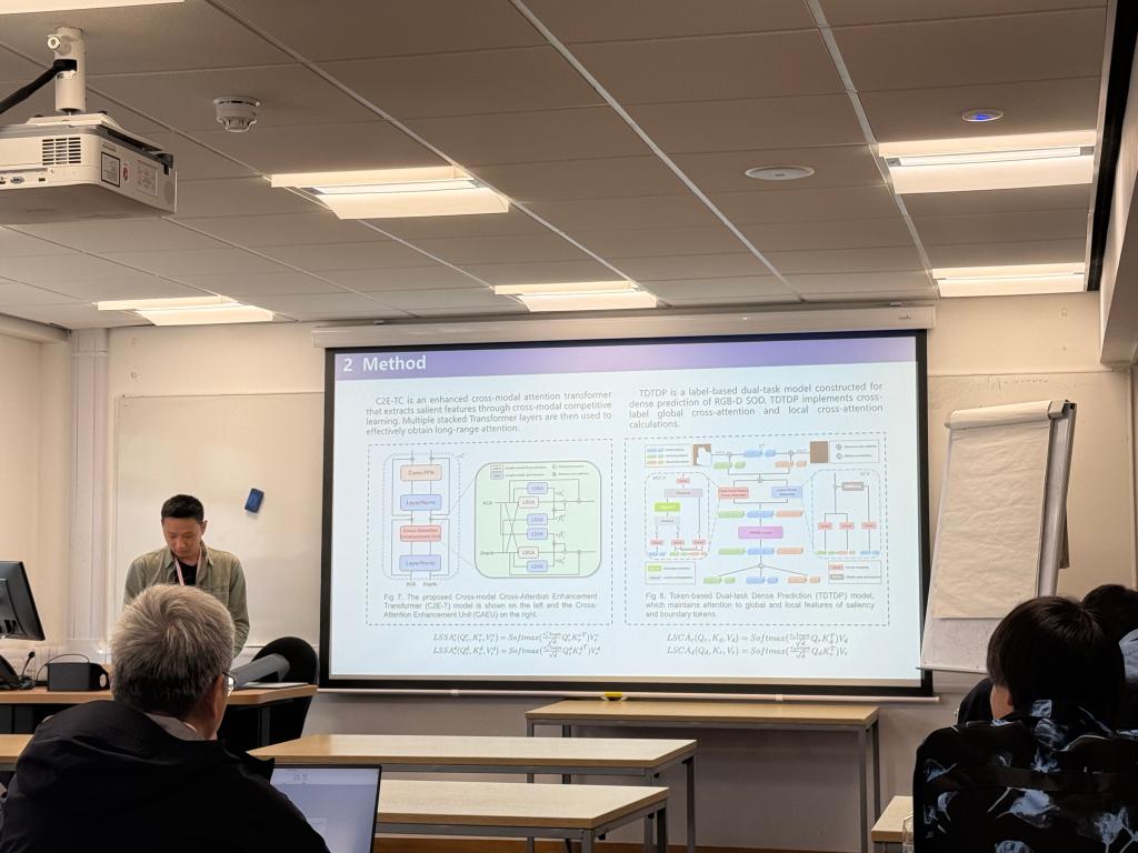 团队谭寒钟做了题为“Hierarchical Enhanced Fusion Transformer for RGB-D Salient Object Detection”的报告。为解决传统 RGB-D 突出物体检测模型在多模态特征提取和融合上的局限,提出了一种分层增强融合Transformer模型(HEFT),以辅助机器人进行导航和避障。该模型采用编码器-转换器-解码器架构,其核心的 C2E-TC 转换器实现了高效的跨模态学习,并辅以多任务 TDTDP 网络提升密集预测性能。在七个基准数据集上验证了其有效性。