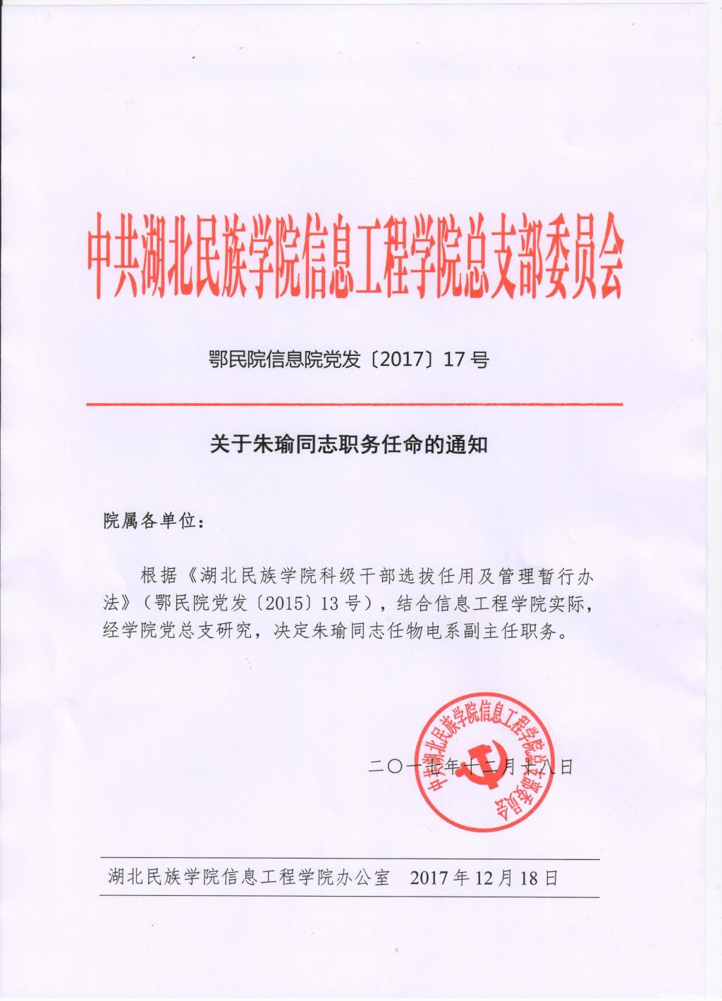 关于朱瑜同志职务任命的通知