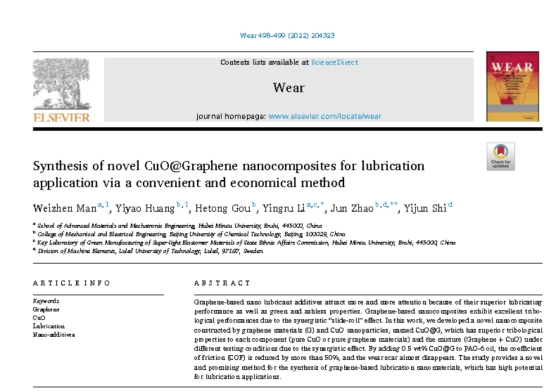 智能学院机械电子工程专业2018级本科生满伟珍同学在国际机械工程领域期刊《Wear》(《磨损》)2022年总第498-499期发表题为《Synthesis of novel CuO@Graphene nanocomposites for lubrication application via a convenient and economical method》的研究论文。《Wear》是国际知名出版社Elsevier旗下的老牌摩擦学专业期刊,专注机械磨损、润滑、表面工程等领域,已成立65年。2021年影响因子4.695,为中科院2区Top期刊。