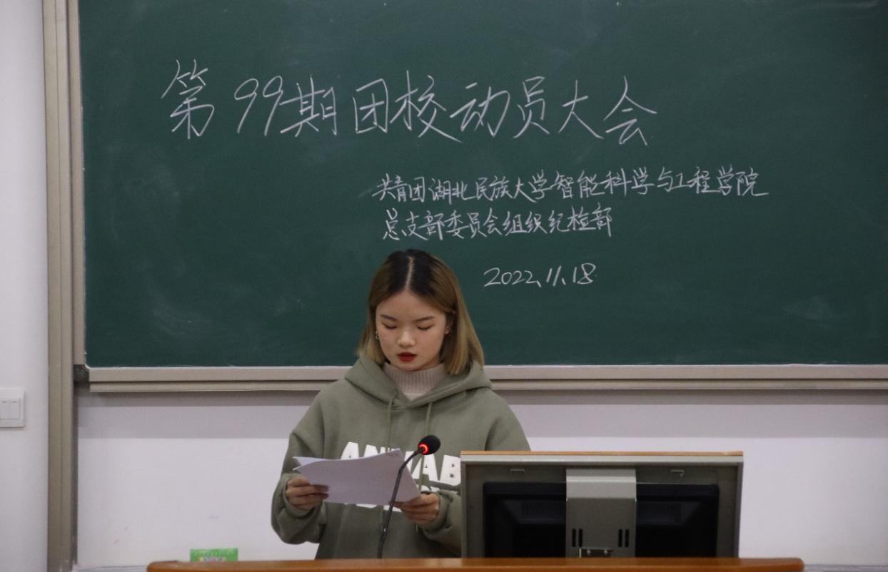 大会伊始,全体起立,奏唱团歌,在高昂响亮的歌声中,团校动员大会正式开始。在此次大会中,主持人胡谭佳讲解了团校的课程安排和团校管理办法,让团校学员对团校有了清晰的认识。随后,由团总支副书记魏君亦宣读了《关于举办365电子娱乐官方网站团校第98期培训班的通知》,并从团校指导思想、培训目的、组织实施方案以及培训课程安排四个方面对本期团校进行讲解。大会最后,胡谭佳再次强调了团校的授课要求和时间安排,提醒学员们认真对待团校学习。