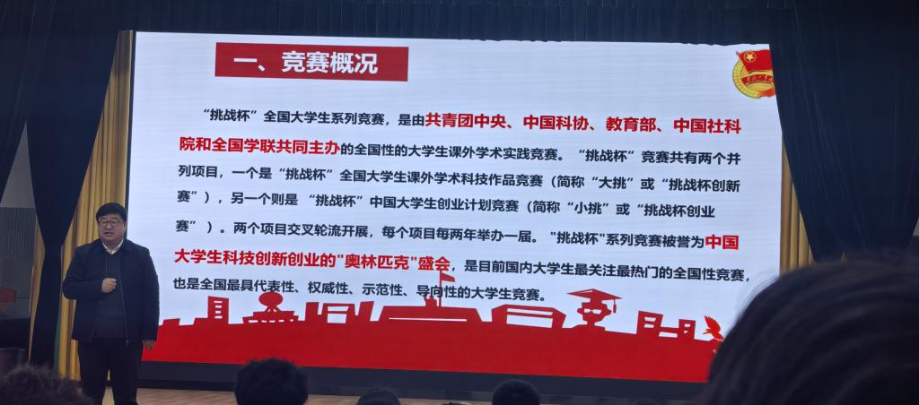 挑战杯为一项极具影响力的赛事,旨在鼓励广大青年推动产学研融合互促,投身国家经济、政治、文化、社会和生态文明建设,在培养学生创新精神与实践能力、激发学生创造力、促进课外学术科技活动开展等方面意义深远。为帮助我校学生更好备赛,充分发挥挑战杯的育人价值,我校特开展此次挑战杯培训会,期望通过系统讲解、经验分享,助力同学们深入理解赛事规则,掌握备赛技巧,提升项目质量,在比赛中取得优异成绩,实现自我成长与突破。