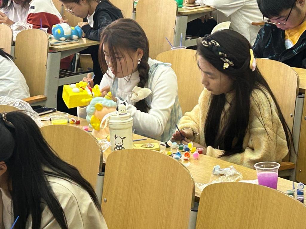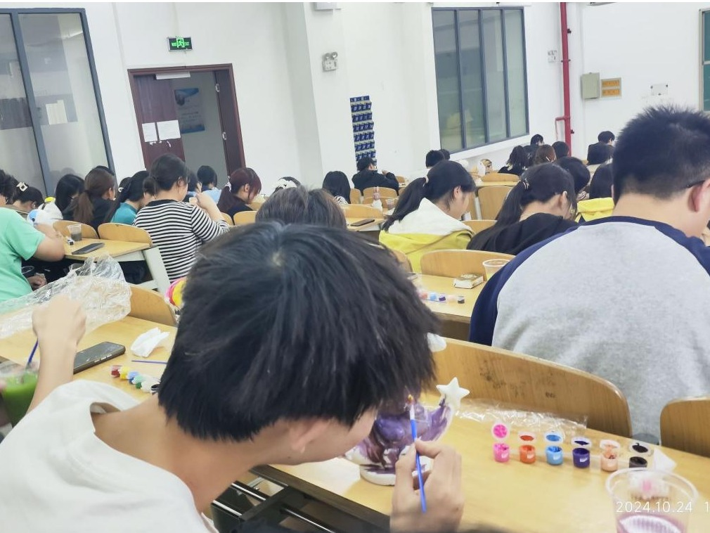 活动现场气氛热烈而有序。洁白的石膏娃娃在桌上整齐排列,等待着同学们赋予它们新的生命。活动参与者们展现出各自独特的技巧,蘸、转、抹、勾,不断绘画着,手中的画笔灵动又流畅,不一会儿,一个个色彩斑斓、生动形象的石膏作品便呈现在眼前。