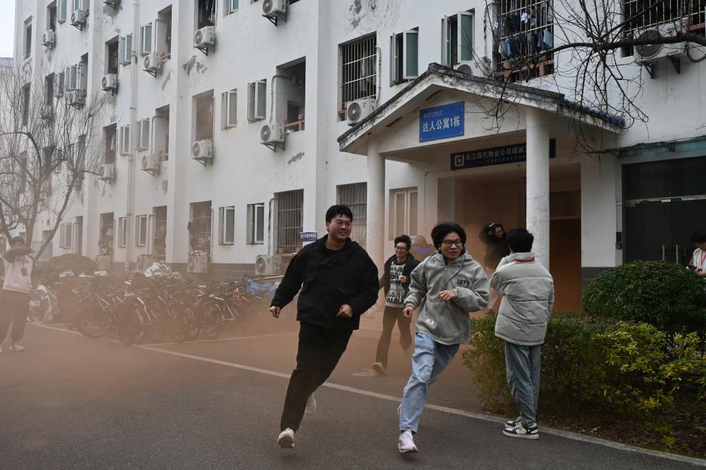 14:30,演练正式启动。随着火灾报警声响起,达人1栋门口迅速释放模拟烟雾,模拟真实火情场景。疏散引导组工作人员立即到位,按照预定方案有序引导楼内学生用湿毛巾捂住口鼻,采取弯腰低姿的正确姿势,沿疏散通道快速、有序撤离至修院楼A区前方空地安全区域。整个疏散过程紧张有序,师生响应迅速,未出现拥挤、慌乱等情况,充分展现了前期培训与筹备的成效。