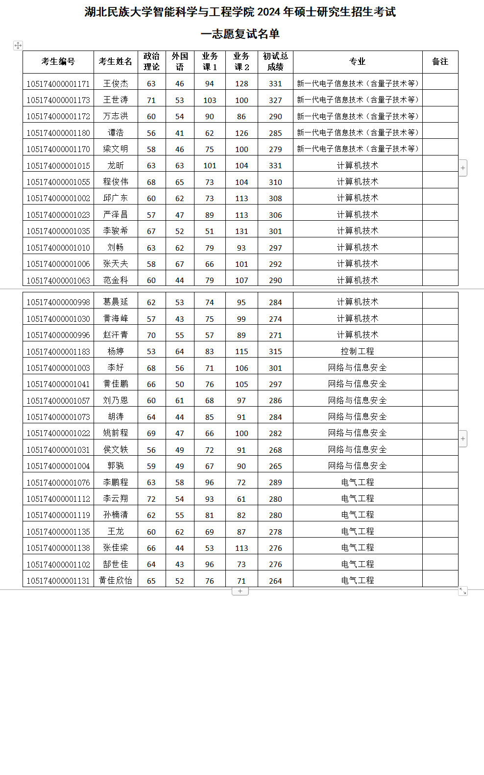 365电子娱乐官方网站智能科学与工程学院2024年硕士研究生招生考试一志愿复试名单