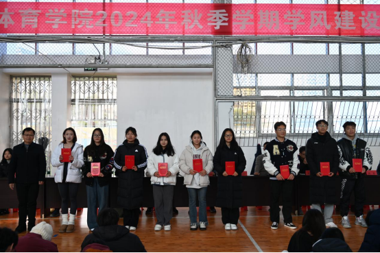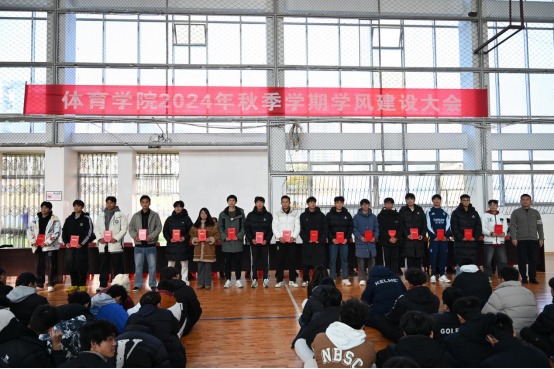 随后,胡庆华副院长宣读《体育学院关于通报表扬2023-2024学年和2024学年秋季学期先进个人及集体的决定》,对本学年我院在全国全省赛事如第十二届全国少数民族传统体育运动会获佳绩,学校综合测评中名列前茅并荣获国家奖学金、学校特等奖学金和一等奖学金以及运动会等单项赛事中表现优异的本科生和研究生进行表彰,在学生群体中树典型、奖模范,弘扬向上向好的优良学风,引导同学们汲取榜样力量,朝着自己的人生目标不断奋进。同时,党总支委员宋庆龙对在学风建设中要求不严和存在不足的集体和个人提出批评,强调要遵守校纪校规、认真学习,争做时代好青年。