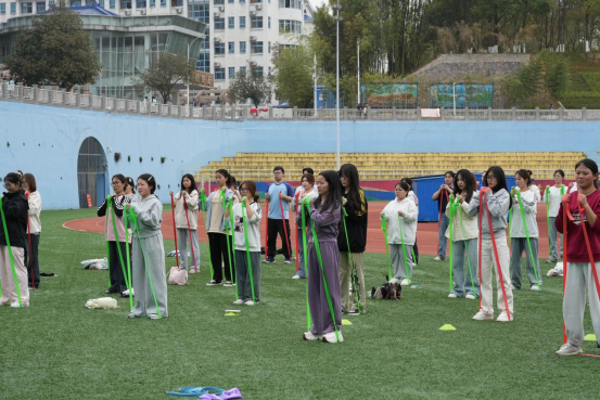 最后,在专业教练的带领下,学生们跟随动感音乐完成了燃脂操训练。教练通过口号和示范,细致指导学生的动作,确保训练的科学性和安全性。学生们在老师的指导下学习弹力带的使用技巧,从生疏到熟练,逐渐掌握了动作要领,现场氛围积极热烈。