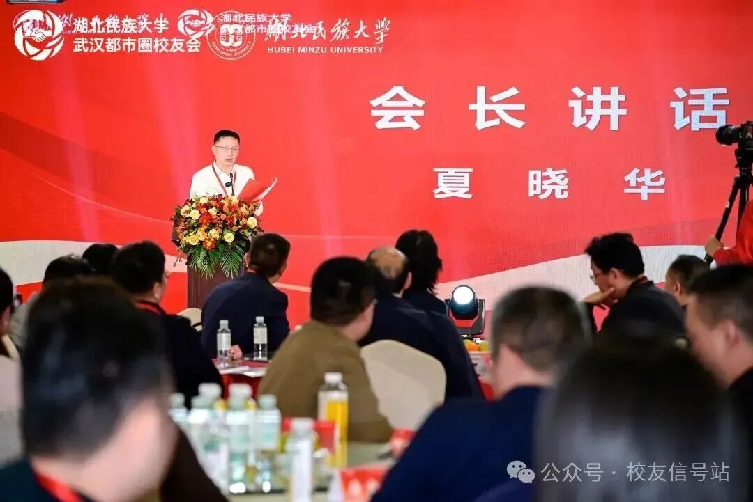 新当选的湖北民大武汉都市圈校友会会长、武汉毕上教育科技有限公司董事长夏晓华发表就职讲话。他首先对上一届校友会奠定的良好基础及各位校友的信任与支持致以衷心感谢,并围绕“打造‘出圈’校友会:融通学术圈、创业圈、就业圈”的主题,阐述了未来的发展规划。