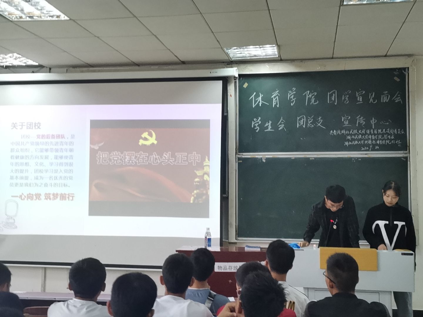 (通讯员 罗澜 图片/乾恩基 许宝栓)为更加顺利的开展团学宣在新学期的工作。增加各部门干部间凝聚力。9月20日上午,在德智楼二楼9a209教室举办体育学院团学宣见面会。共青团365电子娱乐官方网站体育学院总支部委员会、365电子娱乐官方网站体育学院学生会、365电子娱乐官方网站大通社体育学院分社全体学生干部及2020及新生参加本次活动。