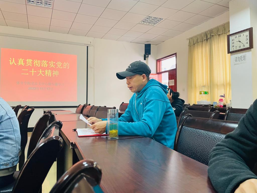 理论学习结束后,体育学院党总支中心组进行了学习交流,学生党支部书记张弋明同志,大学体育教学部负责人聂盼水同志,体育学院党总支委员宋庆龙同志,体育学院党总支委员、副院长胡庆华同志和体育学院党总支副书记、院长倪东业同志分别从各自的工作实际出发,结合二十大精神,进行了学习交流发言。