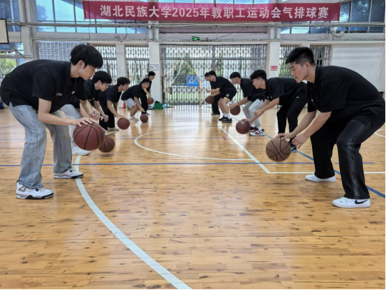 在出征仪式开始前,体育学院党总支副书记万利为全体志愿者组织了岗前培训会。会上,万利副书记勉励大家要深刻理解并践行姚基金的公益理念,弘扬“奉献、友爱、互助、进步”的志愿者精神,将所学专业知识转化为服务乡村教育的实践能力。此次培训之前,万利副书记与教练员宋庆龙、韩表表老师还组织志愿者们进行了教学技能展示。志愿者们动作规范、技术扎实,配合默契,凭借出色的篮球技艺和饱满的精神状态,展现出湖北民大学子过硬的专业素养与昂扬向上的青春风采,也为即将开展的支教工作奠定了坚实基础。