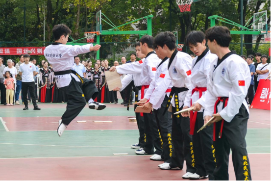 在正式比赛开始前,精彩的暖场节目轮番上演:龙狮表演《中华精神》气势恢宏,跆拳道表演《烈火战马》刚劲有力,民族舞《黔·行》韵味十足,啦啦操《青春绽放》活力四射。这些表演由体育学院和音乐舞蹈学院的同学们共同呈现,为接下来的篮球竞赛注满了青春动能。