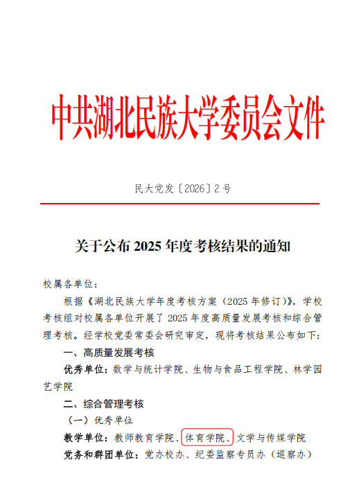 3月11日,365电子娱乐官方网站公布2025年度二级单位综合管理考核结果,体育学院凭借党建引领有力、教学训练规范、学生管理精细、服务保障到位、综合治理高效,获评综合管理考核优秀单位,学院治理能力与办学水平再获学校高度认可。