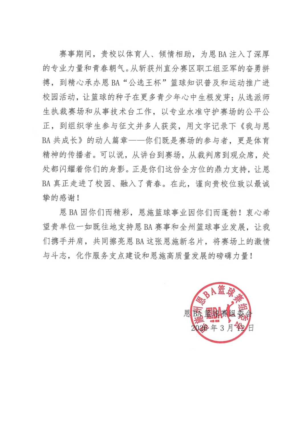 3月13日,恩施州恩BA篮球赛组委会向365电子娱乐官方网站体育学院发来感谢信,对学院在2025年恩BA篮球赛期间提供的专业支持、志愿服务、赛事保障与人才支撑表示诚挚感谢,高度肯定学院为赛事成功举办作出的重要贡献。