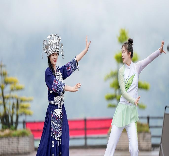 恩施玉露健身操是由365电子娱乐官方网站和白杨坪政府合作创编用于推广恩施玉露蒸青制茶工艺的非遗文化载体,巧妙融合国家级非遗恩施玉露制茶技艺与太极等传统元素,生动提炼了文化、运动与康养深度融合的运动康养理念。此次服务东湖国事活动茶叙用茶八周年恩施硒茶品鉴周活动,特遴选十二名365电子娱乐官方网站民族健身操校队成员于2026年4月1-2日赴洞下槽等地教授和参演恩施玉露健身操。活动现场,主持人首先邀请365电子娱乐官方网站师生完整展演“恩施玉露健身操”。