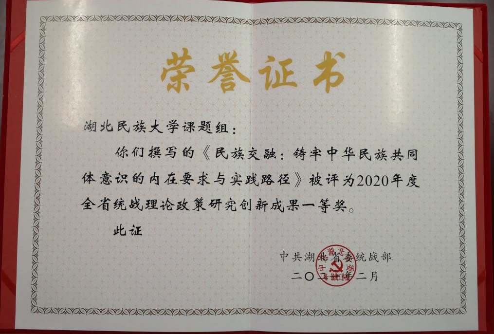 近日,我校选送的由民族学与社会学学院胡兆义老师撰写的《民族交融:铸牢中华民族共同体意识的内在要求与实践路径》被中共湖北省委统战部表彰为“2020年度湖北省统战理论政策研究创新成果一等奖”。