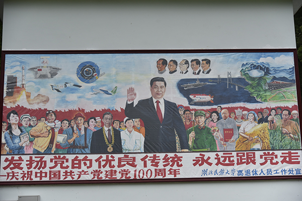 (通讯员 但悠梦 李玉山)为庆祝中国共产党成立100周年,我校农工党党员、工艺美术师、恩施州市书画协会会员、75岁老教师李让奎怀着对党的无限敬仰,耗时两个月,创作了长8米、宽3.4米的巨幅宣传画。画作悬挂在离退休工作处办公楼右侧墙壁。