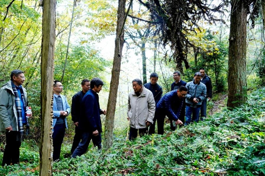 余展琛(左五)等在丰竹坝村考察黄连种植