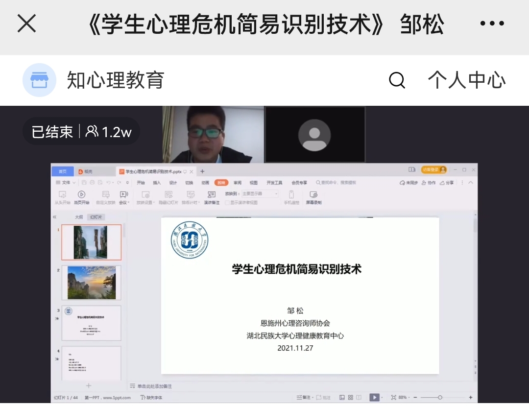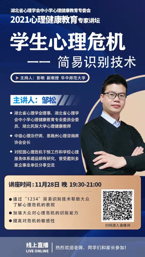11月28日晚,民进会员、恩施州心理咨询师协会会长、我校心理学教师邹松受湖北省心理学会中小学心理健康教育专委会邀请做客“2021心理健康教育专家讲坛”,通过线上直播作了《学生心理危机简易识别技术》专题讲座,华中师范大学彭明副教授主持本次活动。