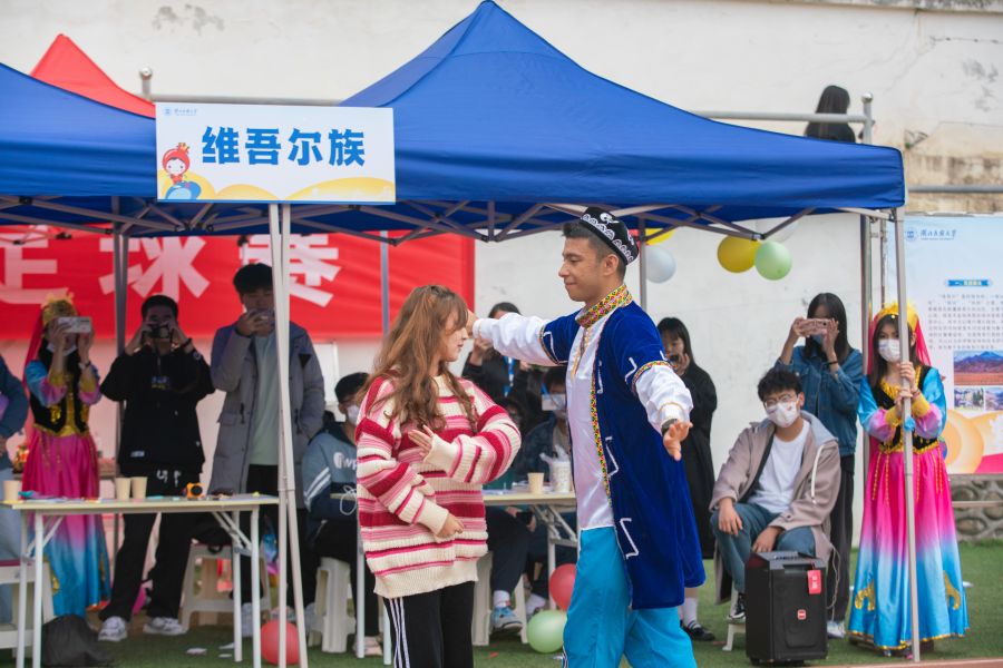 开幕式当天,中华民族一家亲游园会活动在民族体育场举行。来自各个学院(部)的少数民族学生身着各族民族服装,对各自民族的概况、文化、饮食、服饰等方面进行讲解。各二级学院通过开展趣味小游戏、展示图文结合式展板、表演少数民族舞蹈等多种方式向学生传播少数民族文化,参与游园会的学生可以通过完成游戏项目,赢得精美礼物。其中,教师教育学院的东乡族文化艺术展示吸引了参加活动的领导及众多师生的关注,此外,民族学与社会学学院设置“三角斗”“对斗”等比赛,文学与传媒学院开展“别样祝福”“小小挑战”等活动,林学园艺学院的畲族站点设置民族知识问答和“采柿子”等活动吸引了大量同学踊跃参加,各个学院开展的各具特色、欢乐有趣的活动使青年学子对多元一体的少数民族文化有更全面的认识,也进一步增强了各民族间交往交流交融的和谐氛围。
