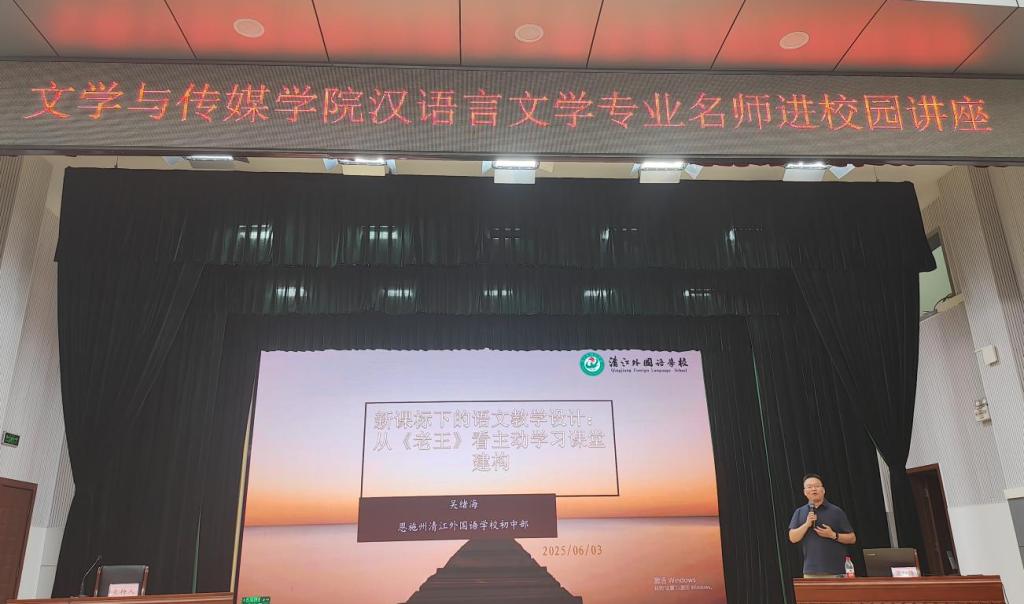 2025-06-07本网讯(通讯员 贾雨欣)6月5日,恩施清江外国语学校初中部龙凤校区校长、中学高级教师吴绪海应邀到访我院,在行政楼一号会议室为汉语言文学专业师生作了题为“基于新课标的主动学习——以部编版《老王》为例浅谈...