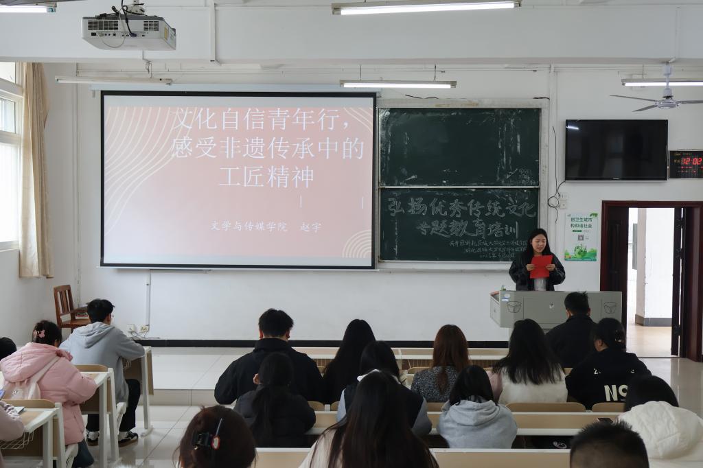 本网讯(记者 管继荣 曹登霄/文 莫秋萍/图)3月22日,我院在文瀚楼附102教室举办以“寻脉而往·手传心授”为主题的非遗文化专题学习活动。我院团委书记赵宇受邀出席活动并做专题宣讲与深度解读,团学组织全体成员参加本次学习。活动现场活动伊始,主持人以“指尖滑动屏幕”“千年技艺传承”的时代对...