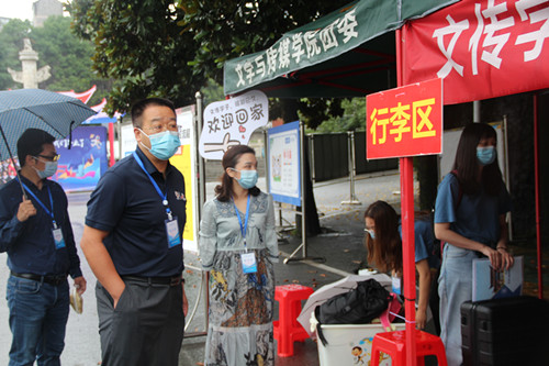 为确保毕业生返校工作安全有序进行,学校在火车站设立了接待点,同学们下火车后通过核验健康码、测量体温、行李消毒等环节,换乘大巴,到校门口后再进行二次核查,然后乘坐校园观光车到学院报到点报到。在文瀚楼前的文传学院报到点,学工科老师们再次核查学生返校登记表,并为毕业生们发放防疫礼包。