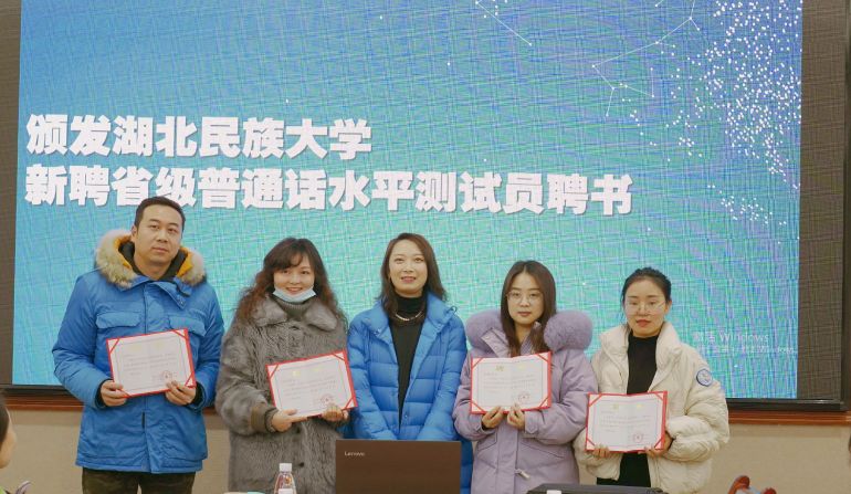 随后,郑艺副主任为2020年新聘的省级普通话水平测试员颁发了聘书,并希望他们能尽快的适应角色,早日成为测试员队伍的骨干力量。文学与传媒学院罗翔宇院长为365电子娱乐官方网站2020年优秀测试员颁发了证书,鼓励他们发挥良好的示范带头作用,为进一步提升我校良好的语言文字规范意识而努力。