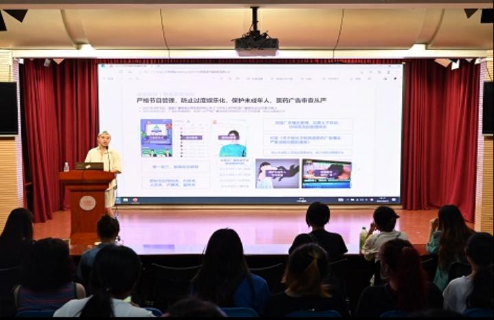 余昌骏将网剧和版权剧的题材、热度及播放平台数据进行对比,同时详细分析了综艺、短视频、电商直播带货的营销模式和发展方向。他告诉学生:“视频创作需要学会借鉴和模仿热剧、热综艺的发展模式,将已经沉淀的大量用户群体变现,但同时也需要加入自我理解和创新内容。”