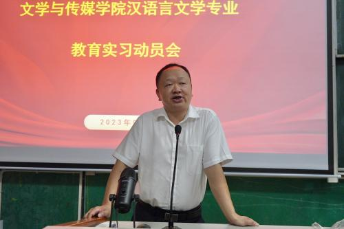 本网讯(记者 王仁茜 刘晓微)9月10日,我院在附202教室举行汉语言文学专业教育实习动员会。学院党委书记张刚、党委副书记李御娇、副院长江佳慧、中文系主任范生彪、教学科张慧、带教老师代表阳萍、班主任熊浚参加会议。江佳慧主持会议。
