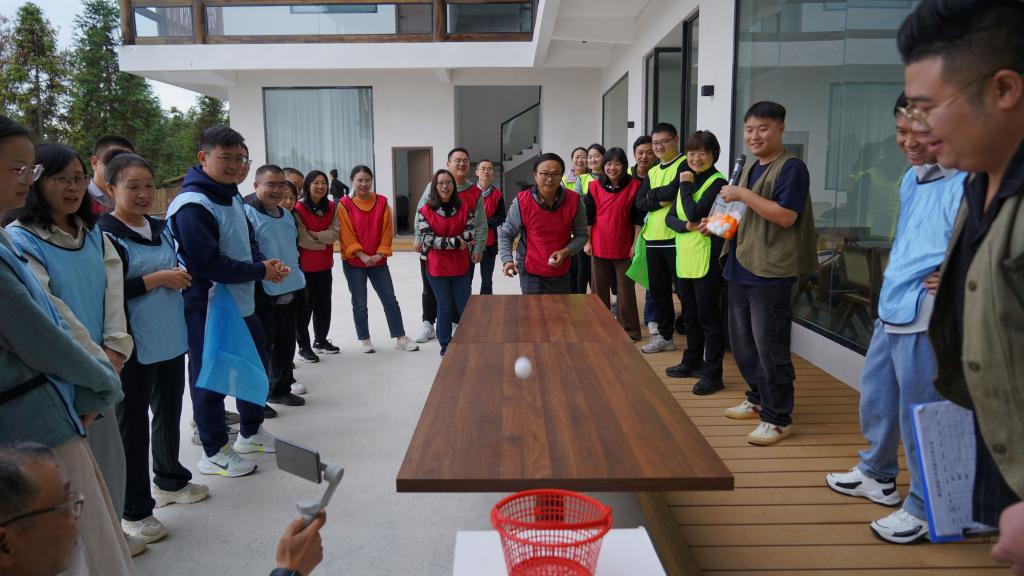 在“珠行万里”这一考验团队协作与策略的趣味团建活动中,队员们手持滑槽,团结协作,确保乒乓球平稳前行,直至终点。