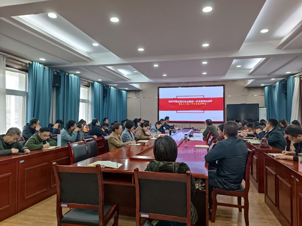 洪雁以《紧扣中国式现代化主题 进一步全面深化改革》为题,深刻阐述了党的二十届三中全会的主题和重大意义,系统解读了进一步全面深化改革的指导思想、总目标、原则和重大举措,强调全面深化改革,必须坚持党的全面领导,坚持以人民为中心,坚持守正创新,坚持以制度建设为主线,坚持全面依法治国,坚持系统观念。要求广大教职工学习掌握进一步全面深化改革的总体框架、首要和核心任务、重大领域、环境和条件,认真落实中央关于学习贯彻党的二十届三中全会精神有关要求,坚定改革信心,积极投身学院改革实践各项工作。