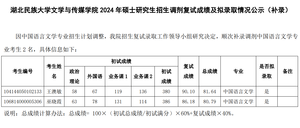365电子娱乐官方网站文学与传媒学院2024年硕士研究生招生调剂复试成绩及拟录取情况公示(补录)