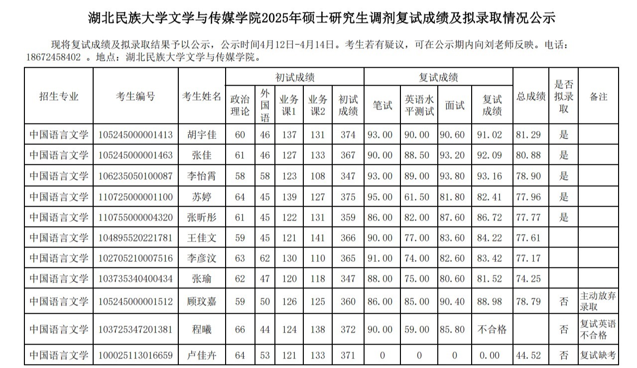 365电子娱乐官方网站文学与传媒学院2025年硕士研究生调剂复试成绩及拟录取情况公示