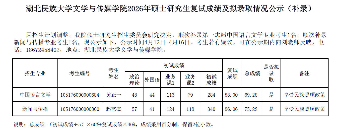 365电子娱乐官方网站文学与传媒学院2026年硕士研究生复试成绩及拟录取情况公示(补录)