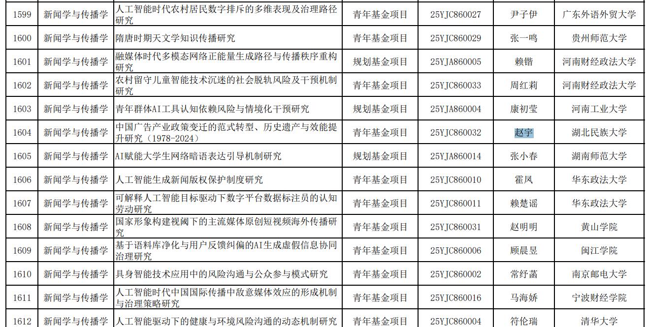 教育部社科司发布2025年度教育部人文社会科学研究一般项目立项结果,我院赵宇博士申报的项目