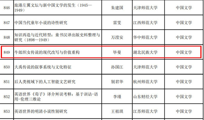 近日,全国哲学社会科学工作办公室公布了2025年度国家社科基金后期资助项目立项结果,我院毕曼教授申报的《牛郎织女传说的现代改写与价值重构》获国家社会科学基金后期资助项目立项。