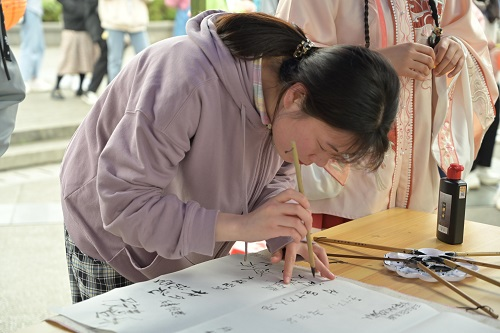 游戏区类型多样的游戏吸引不少学生参与其中,热闹非凡。“踢毽子”充分考验身体协调能力,参与者动作灵活流畅,高超的技能赢得阵阵喝彩;“插花”游戏,参与者精心挑选花枝,耐心细致地修剪花束、搭配色彩,呈现出一个个独具匠心、清新雅致的插花作品;“纸灯笼DIY”游戏,参与者手持毛笔,蘸染颜料,全神贯注地在灯笼上画图题字,在一笔一划的勾勒中体验绘画的乐趣,现场气氛融洽,吸引众多学生驻足。