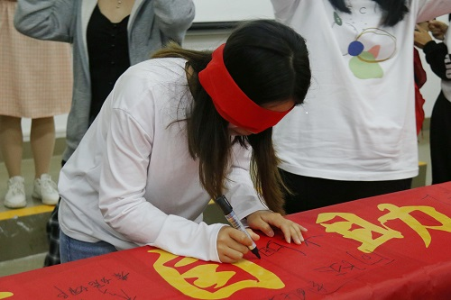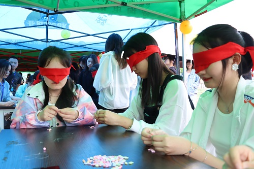 活动现场设置“游戏区”“挑战区”“留言展示区”三个区域,以集章形式进行。“挑战区”设置“拼图”“串手链”挑战。“拼图”区,参与者用红丝带蒙住双眼,依靠触觉将打乱的七巧板拼图重新拼成正方形,或手忙脚乱,或敏捷迅速,充分展现出参与者积极向上的精神风貌;“串手链”区,参与者围坐一旁,蒙住双眼,用细绳将五颜六色的珠子串成精美的手链,参与者动作迅速利落,吸引众多学生驻足观看;“留言展示区”,参与者可以在标签上写下自己对视障者的祝福或参加活动的感悟,留言真切感人,活动现场热闹非凡。