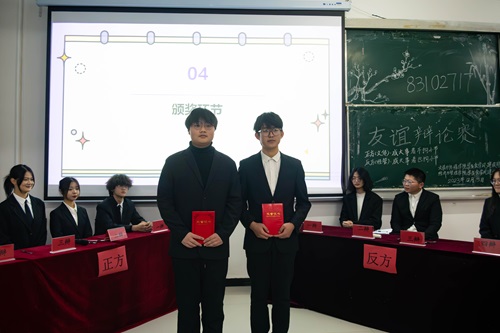本网讯(记者 刘旨奕(见习) 陈佳惠/文 记者 詹姝畅 姜一鸣(见习)/图)12月15日,我院联合经济与管理学院在文传附102教室举办友谊辩论赛。优秀辩手王珮伊、张秋瑞、杨丽君、杨兆佳受邀出席并担任评委。