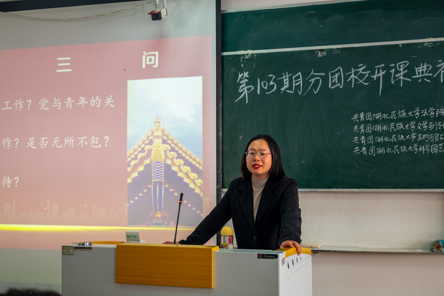 在“论党的青年工作”主题团课中,授课老师谢学婧以课题“党的青年工作”为切入点,结合自身经历,联系实际生活深入展开新时代下党、团和青年的关系,中国梦与青年的关系等系列问题。她表示,中华民族伟大复兴的实现依靠青年也成就青年,中国共青团是党组织力量的助手和后备军,是青年政治生活“人生三部曲”中的关键节点,广大青年应积极投身于社会实践,在实践中磨练自身意志,锻炼真才实学,树立远大理想,坚定理想信念,坚定不移听党话、跟党走,做有理想、敢担当、能吃苦、肯奋斗的时代新人。